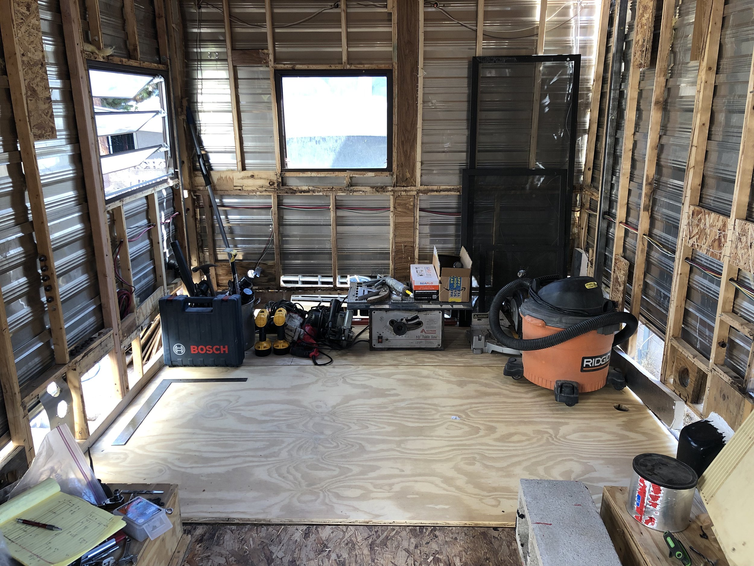 Welding in floor and corner supports, and the beginning of sub-wall and interior fabrication on the back wall. Finally, some interior fab!